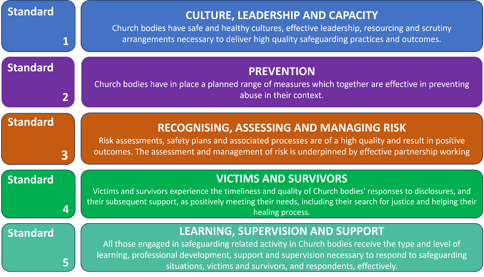 The Church of England has been in the process of developing a set of National Safeguarding Standards and accompanying Quality Assurance Framework, since 2020. This link takes you to a page where you can read more about the National Standards and access resources/self-audit tools etc.